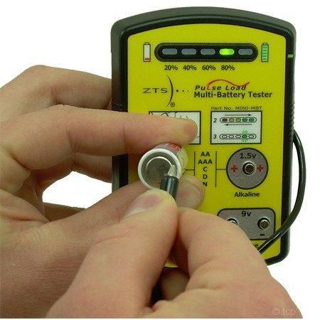 The ZTS Mini Multi-Battery Tester™ provides a comprehensive means of testing the state of charge or state of power for more than 15 battery types. The MINI-MBT’s microprocessor-based design makes battery testing simple - using a patented, high accuracy pulse load test.  After a fully automatic test cycle, percentage of remaining battery capacity is indicated on the LED bar display. Battery types are clearly labeled next to appropriate contacts. There are no settings, and test results are easy to understand. Its small size makes it ideal for the gadget bag, toolbox, or home utility drawer. Negative test lead/probe conveniently stores in seam at side. Tests NiMH, and Alkaline batteries. Uses 4AAA batteries (not included) Made in U.S.A.